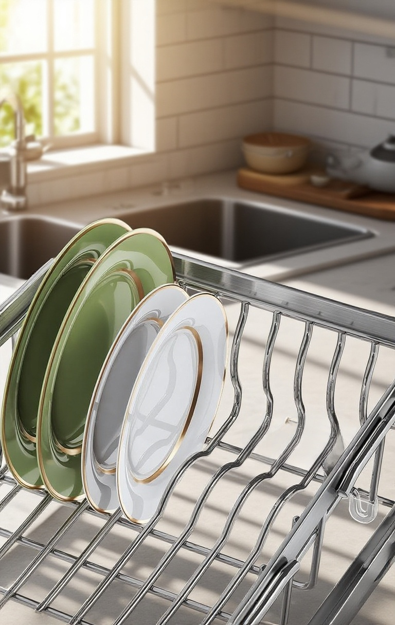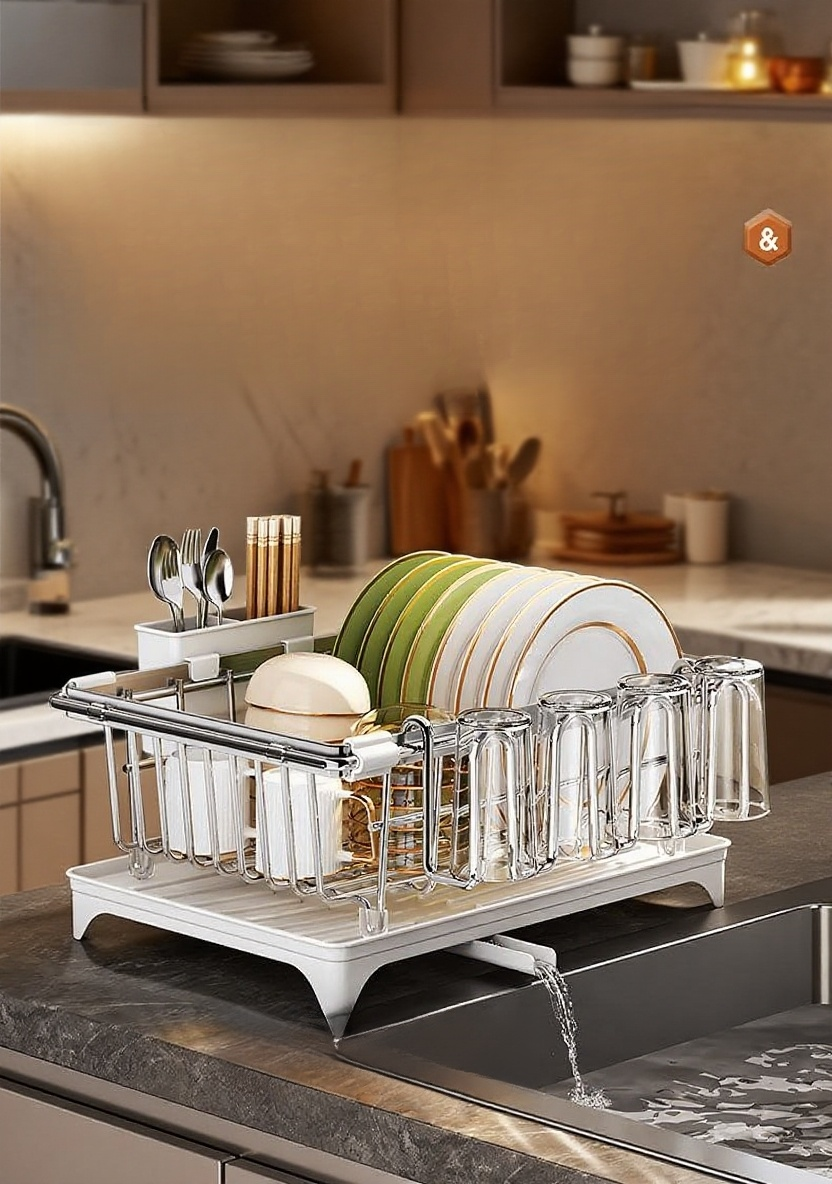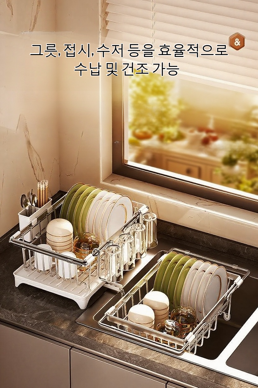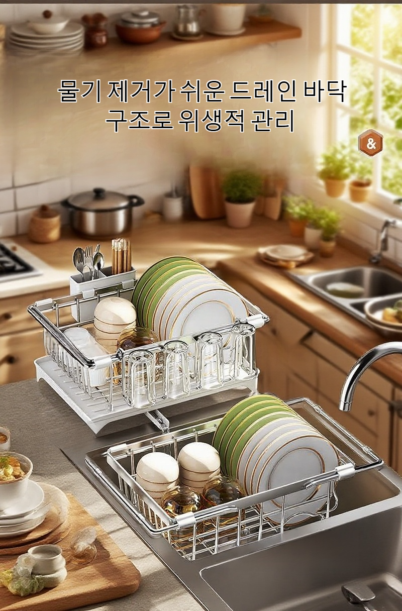 내구성이 뛰어난 스테인리스 스틸 소재로 제작, 녹 방지 및 청소 용이, 공간 효율적 수납, 설치 간편, 다양한 주방용품 정리 가능